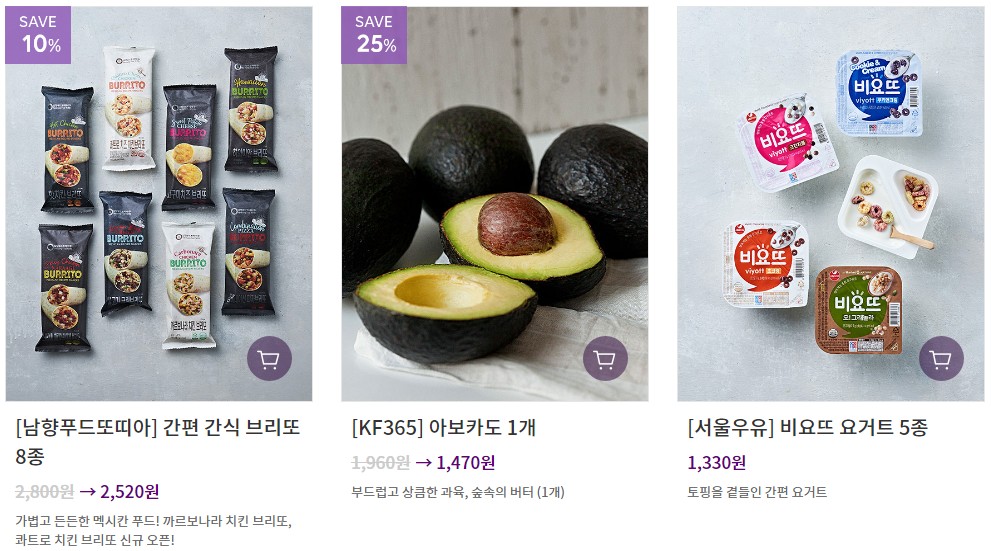 간편 간식 브리또 8종, 아보카도, 비요트 요커드 5종 제품이 베스트 상품입니다 특히 아보카도는 상태가 좋은데요 빵이랑 같이 먹으면 정말 일품입니다 건강에도 물론 매우 좋다고 알려져 있죠