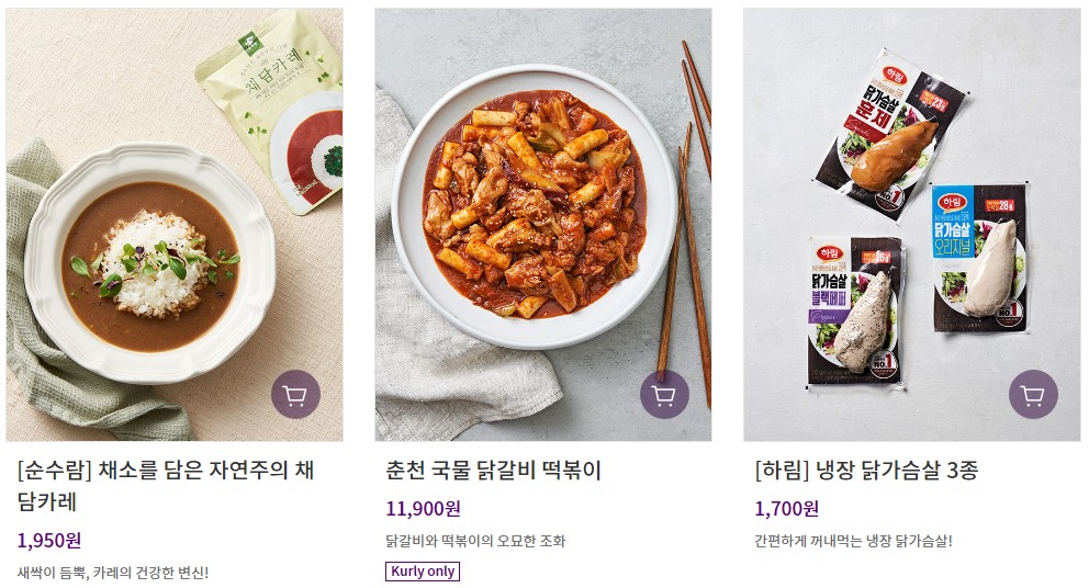 채소를 담은 자연주의 채담카레, 춘천 국물 닭갈비 떡볶이, 닭가슴살도 마켓컬리 추천상품 입니다