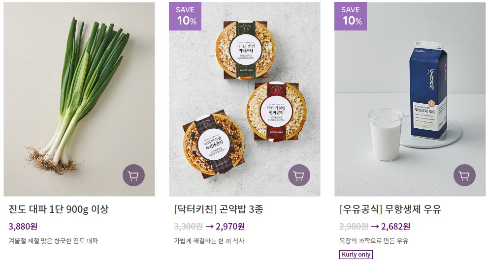 진도 대파, 곤약밥, 무항생제 우유가 마켓컬리 신상품으로 추가되었습니다