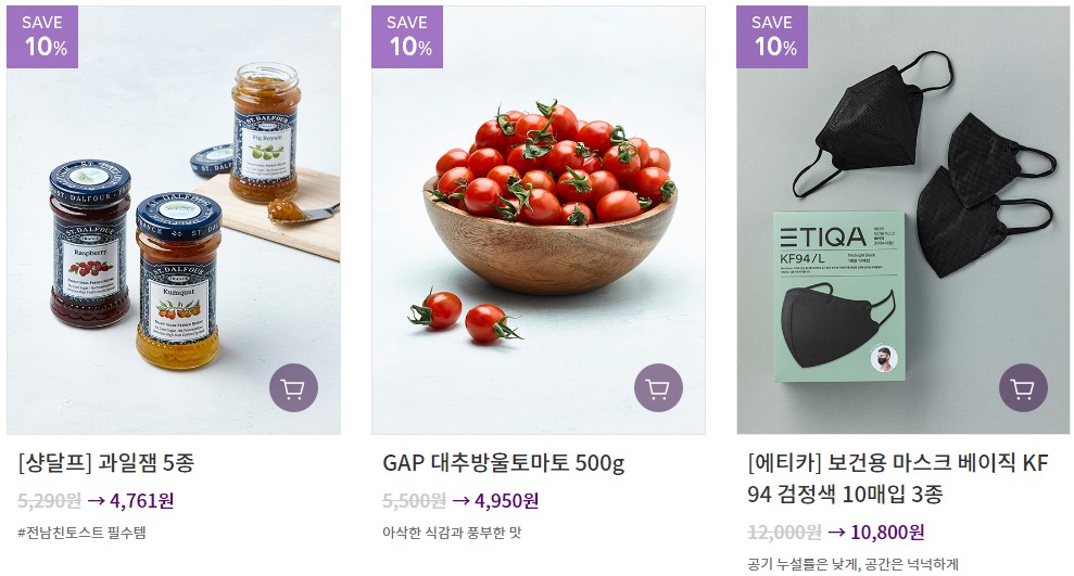 과일잼, 대추방울토마토, 검은색 마스크도 할인 중에 있습니다
