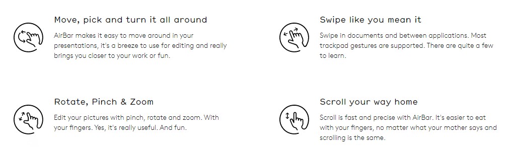 그리고 에어바(AIRBAR)를 통한 맥북 터치스크린은 단순히 터치 뿐만 아니라 탭이나 줌인 줌아웃 스크롤등 다양한 조작이 가능합니다