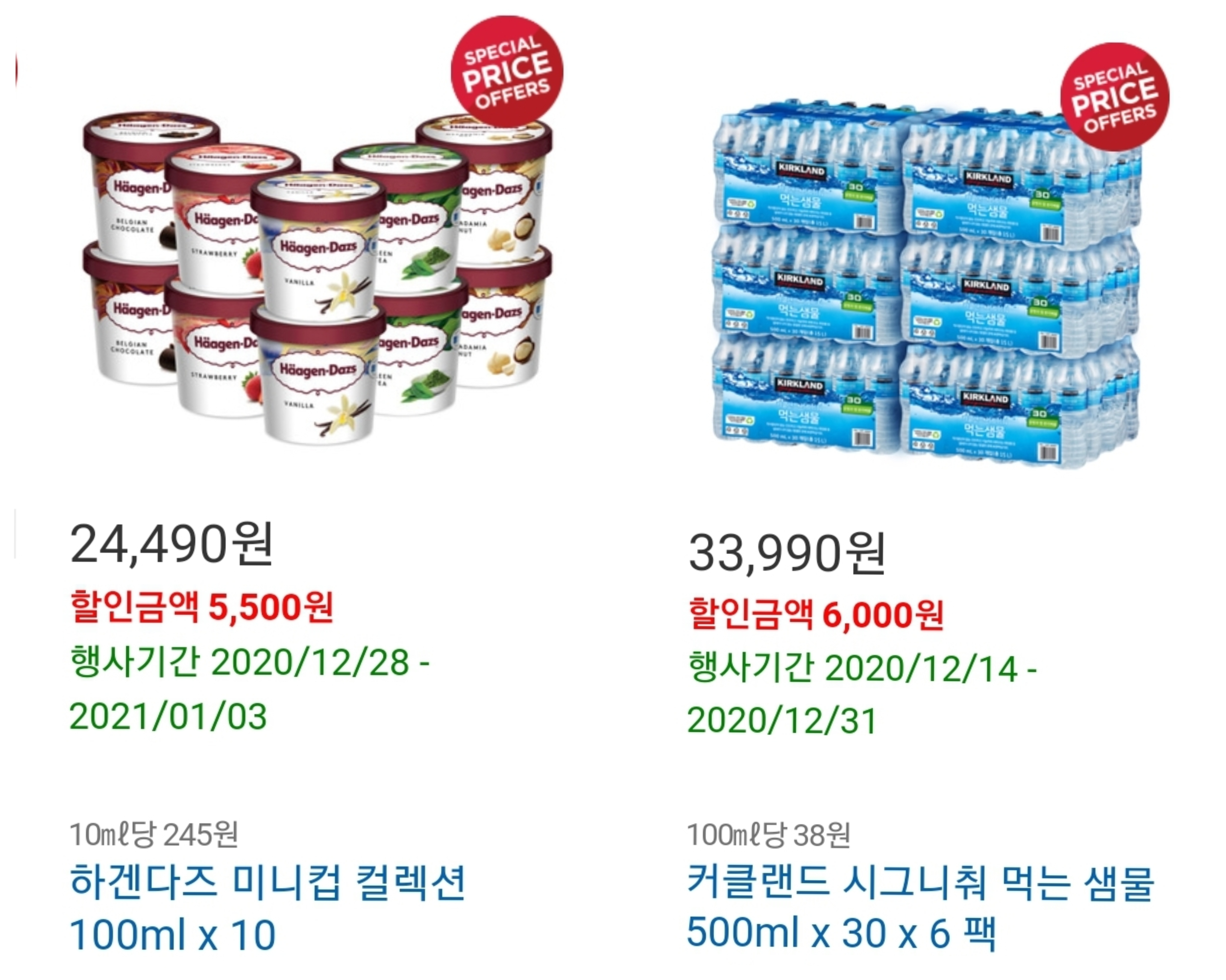 하겐다즈 미니컵과 커클랜드 시그니춰 먹는샘물 코스트코 12월 다섯째주 할인 상품입니다