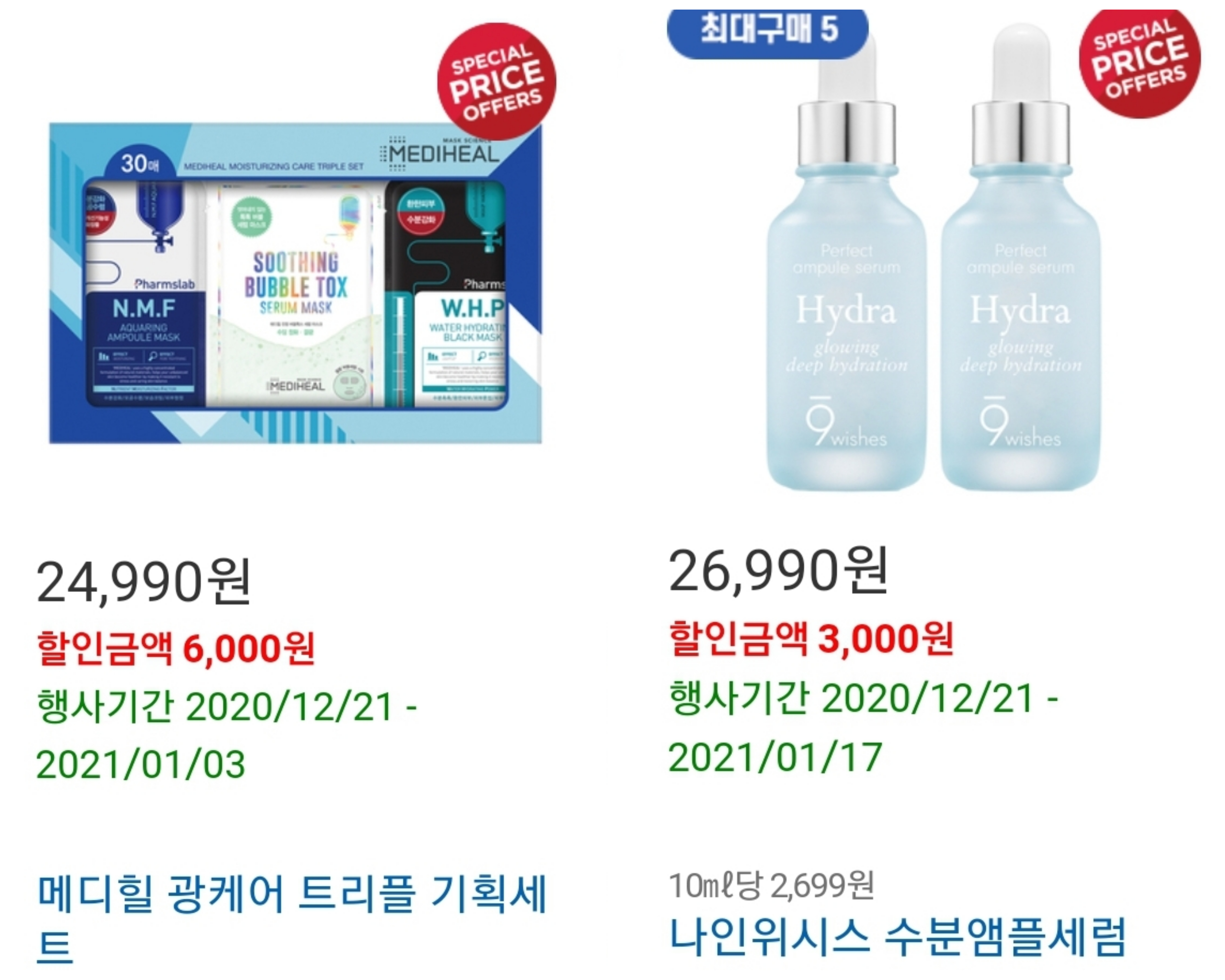 메디힐 광케어 트리플 기획세트와 나인위시스 수분앰플세럼 할인 판매 합니다