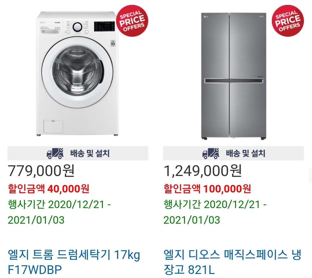 엘지 트롬 드럼세탁기 17kg 엘지 디오스 매직스페이스 냉장고 821l 코스트코 할인 중 입니다