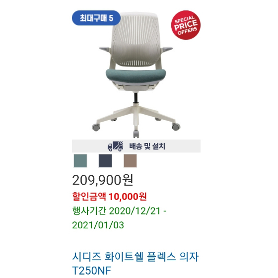 시디즈 화이트쉘 플렉스 의자 최대 5개 구매 가능합니다