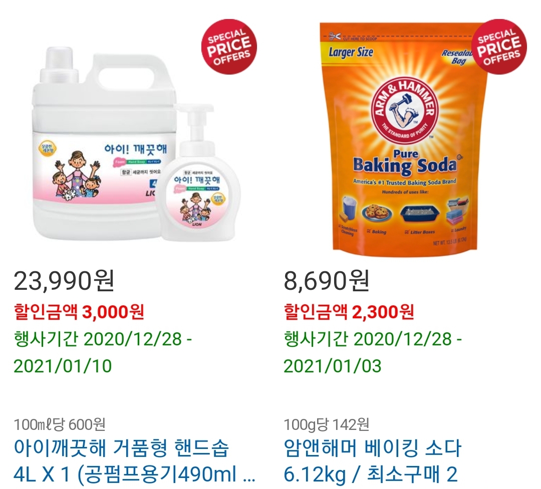 아이깨끗해 거품형 핸드솝과 암앤해머 베이킹소다 6.12kg 제품 코스트코 할인 중 입니다