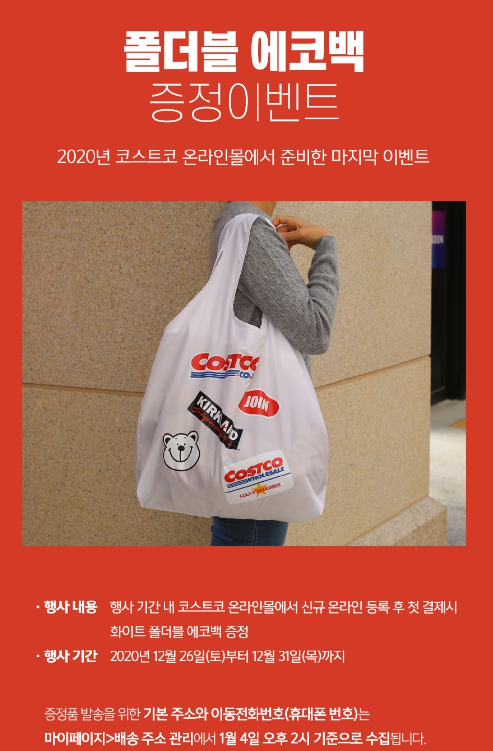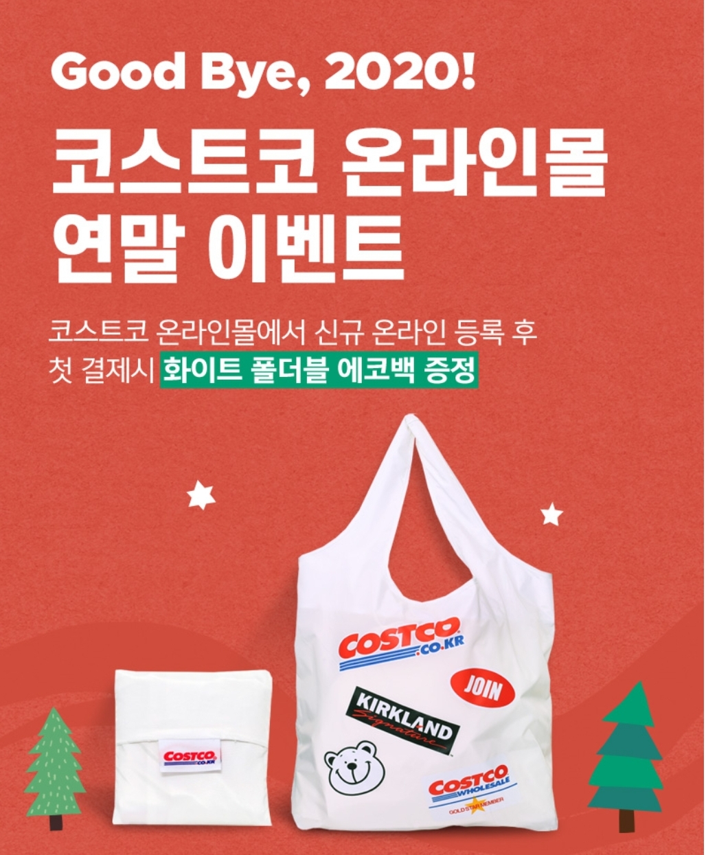 코스트코에서는 2020년 연말 이벤트로 코스트코 온라인몰 신규 가입후 첫 결재시 폴더블 에코백 증정 이벤트를 진행하고 있습니다