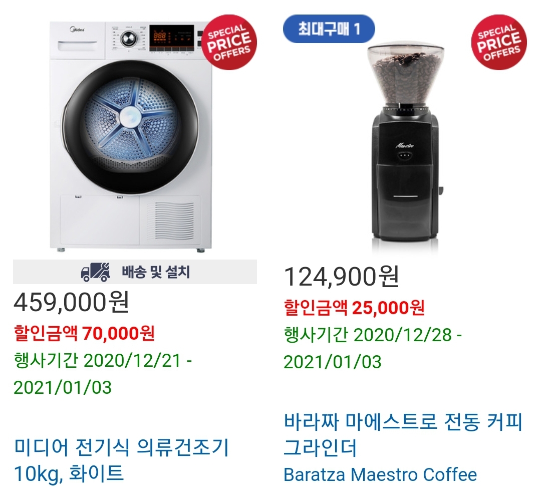 미디어 전기식 의류건조기 10kg 바라짜 마에스트로 전동 커피 글라인더 코스트코 12월 마지막주 할인 합니다