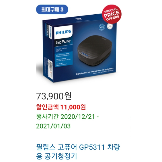 초미세먼지 까지 걸러네는 필립스 고퓨어 gp5311 차량용 공기청정기 할인 중 입니다 헤파필터가 달려있는 제품 입니다
