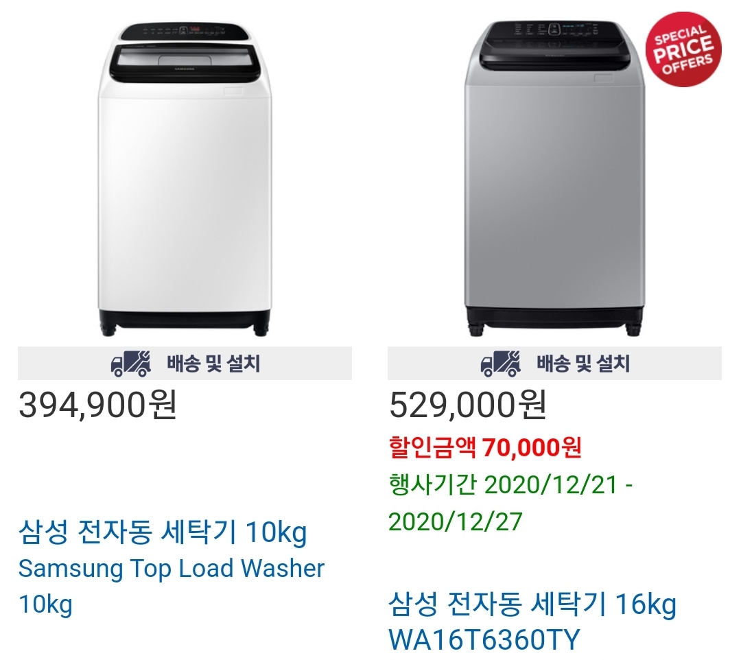 통돌이 세탁기인 삼성 전자동 세탁기 10kg, 16kg 할인 판매중입니다