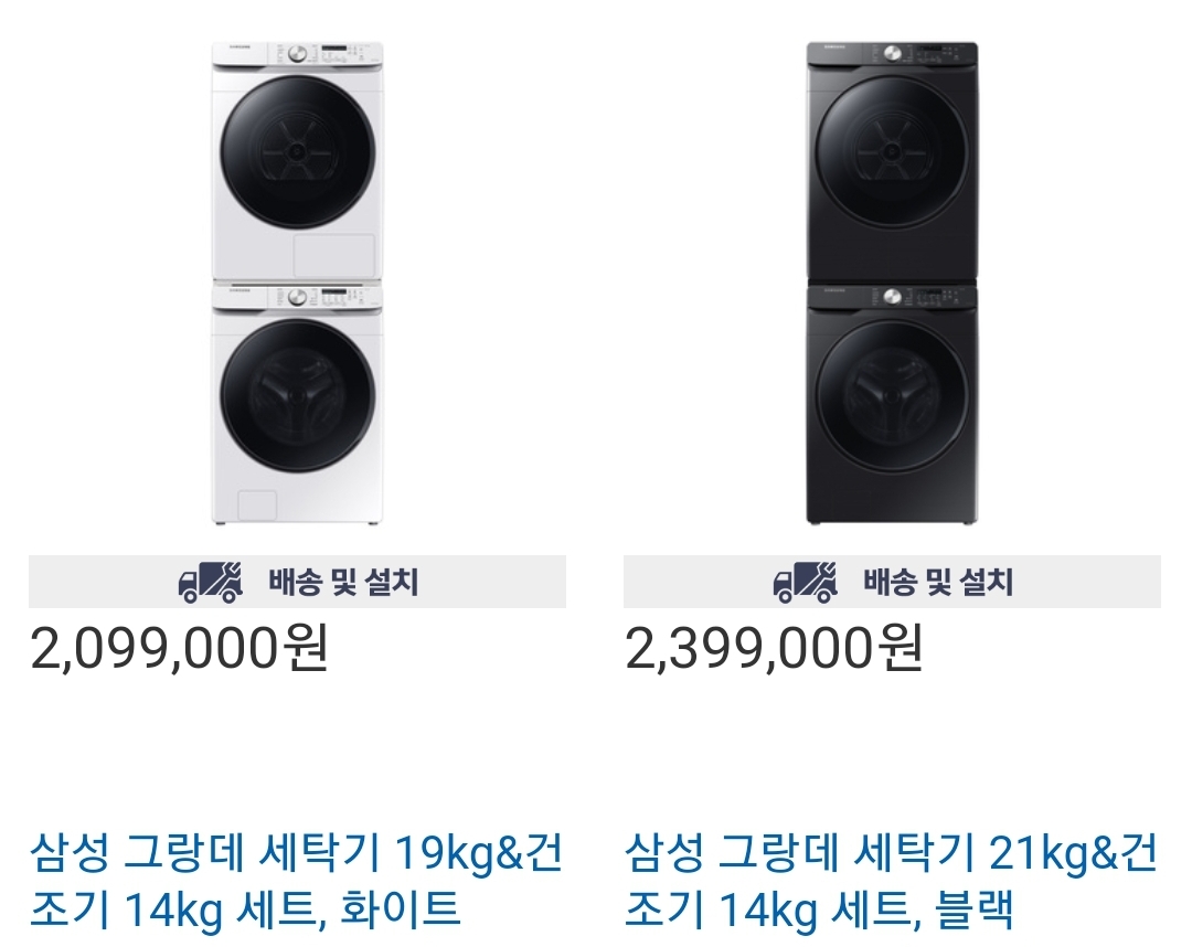 삼성 그랑데 세탁기 19kg & 건조기 14kg 화이트 세트, 삼성 그랑데 세탁기 21kg & 건조기 14kg 블랙 세트 입니다